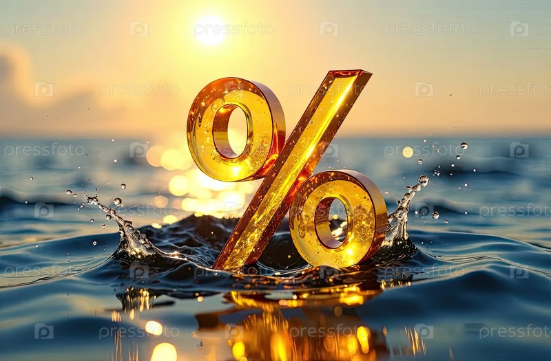 Светящийся золотой процентный знак в освежающем брызге воды над водой. жаркие летние распродажи и скидки, горящие баннеры туров, листовки. ИИ генерируется