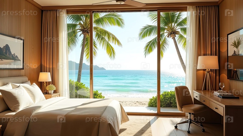Интерьер гостиничного номера с видом на океан для пляжного отдыха и путешествий