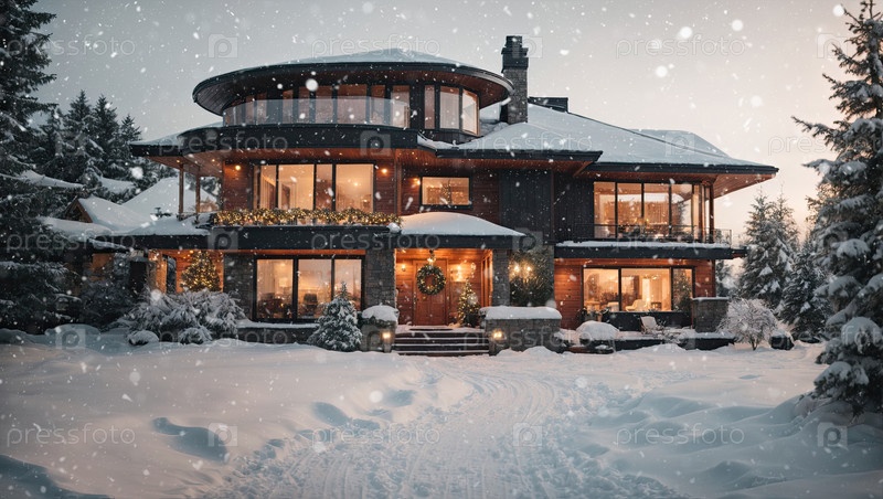 Деревянный современный уютный дом с рождественским декором и снегом, Праздничное настроение. Туризм, путешествия зимой, новогодний отдых, мини-отель, бронирование, страхование, ипотека, жилье, аренда, переезд. AI generated