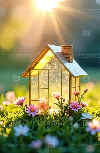 Крошечный эко-дом теплица в солнечных лучах, с весенними цветами на весеннем пастельном фоне. недвижимость, дача, летний дом, ипотека, страхование, бронирование, строительство, изоляция. ИИ генерируется