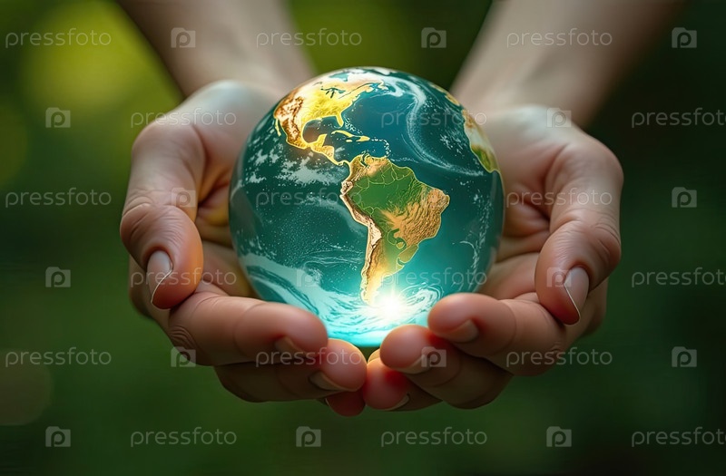 Стеклянная светящаяся сфера планеты Земля На ладонях находится шар с внутренним микроклиматом, заботой о планете, чистой окружающей среде, защитой экологии, географии, континентов, путешествий