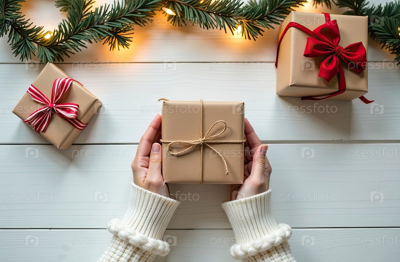 Упаковать подарок на Рождество и Новый год в крафт-бумаге, привязанный веревкой с луком с рождественским декором на белом столовом столе, натуральный декор. Праздничное настроение. Flatlay, background, copy space. AI generated