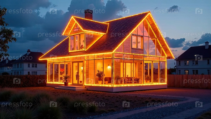 Прозрачное золото светящийся проект дома в натуральном размере на земельной площади. недвижимость, риэлтор, ипотека, страхование, здания, строительство, изоляция, отопление. ИИ генерируется