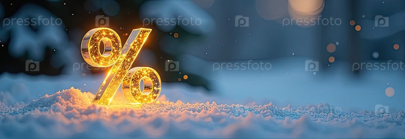 Неон светящийся золотой процентный знак на снежном фоне снаружи, блеск и снежинки. Зимняя распродажа и скидки, Черная пятница, Новый год, Рождество. баннер, флаер с копировальным пространством. ИИ генерируется