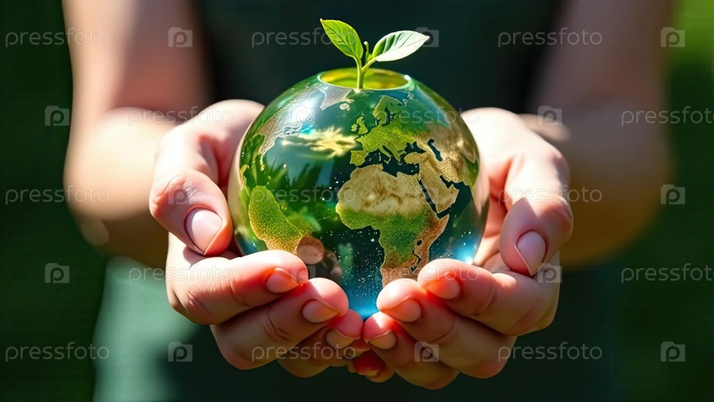 Светящаяся стеклянная сфера планеты Земля с зелеными растениями, растущими в руках детей, забота о планете, чистая окружающая среда, защита экологии, зеленая планета