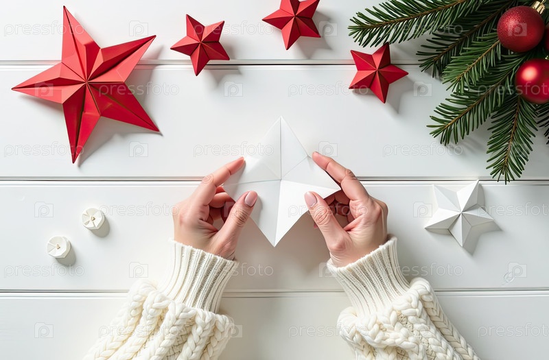 DIY оригами-бумага своими руками на Рождество и Новый год, с рождественским декором на белом столе из доски, натуральный декор. Праздничное настроение. Flatlay, background, copy space. AI generated