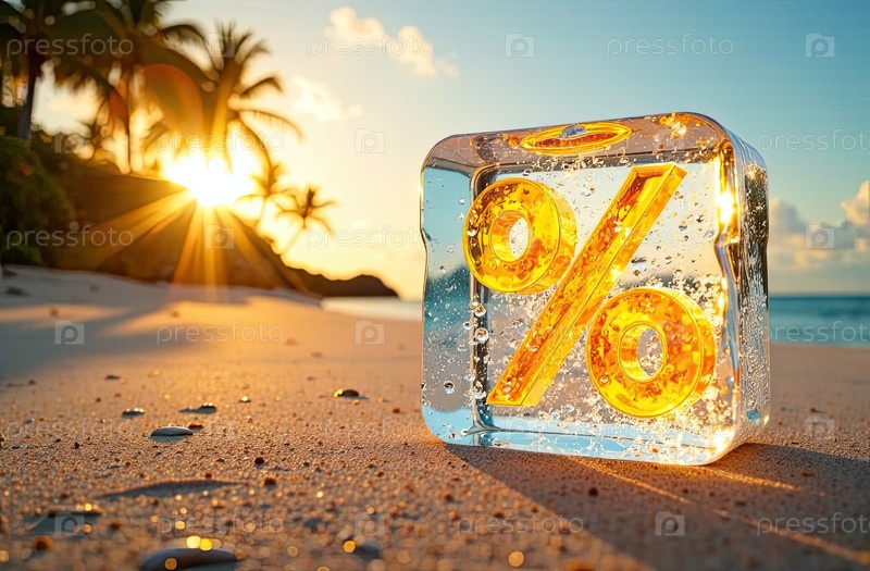 Неон светящийся золотой процентный знак в кубике льда на берегу моря с тропическими пальмами при солнечном свете, туристический фон. Горячая летняя распродажа и скидки, горячий баннер тура, флаер. ИИ генерируется