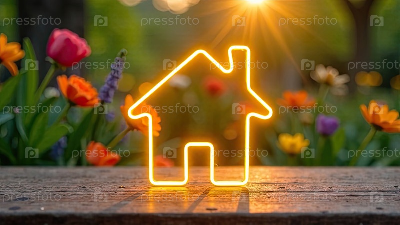 Прозрачное золото светящийся символ дома стол с весенним цветущим солнечным фоном. недвижимость, риэлторская деятельность, ипотека, страхование, бронирование, строительство, изоляция. AI generated