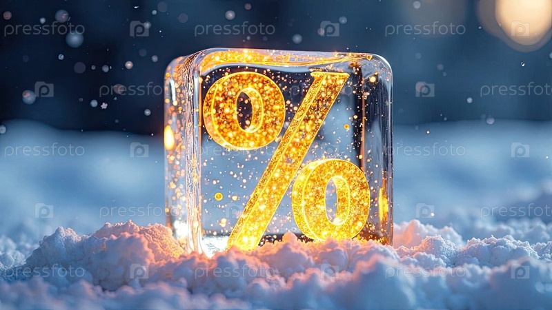 Неон светящийся золотой процентный знак в кубике льда на снежном фоне снаружи, блеск и снежинки Зимние распродажи и скидки, Черная пятница, Новый год, рождественский баннер, флаер. AI generated