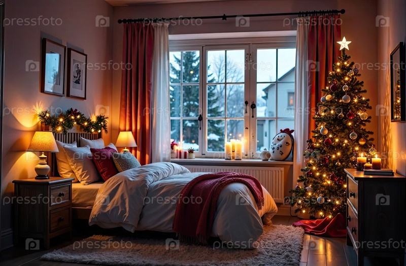 Уютная спальня с кроватью у окна с рождественским декором и елкой, теплыми гирляндами света и свечами - вид изнутри зимой и снегом. Отпразднуйте Рождество и Новый год, рождественское настроение. ИИ генерируется