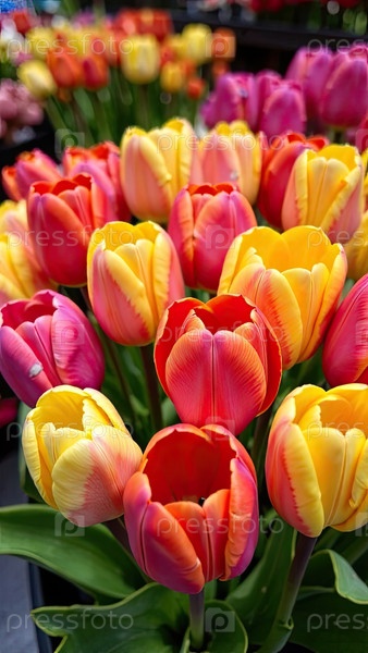 Красочные букеты тюльпанов в цветочном магазине - свежерезанные цветы на складе и стеллажи для продажи, доставка к празднику. весна, 8 марта, женский день, день рождения. ИИ генерируется