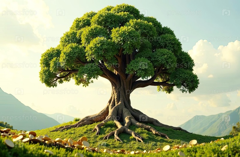 Взрослое зеленое дерево растет из земли и золотые монеты на природном фоне. Древо денег, экономика, финансы, экология, бизнес, стартап. ИИ генерируется