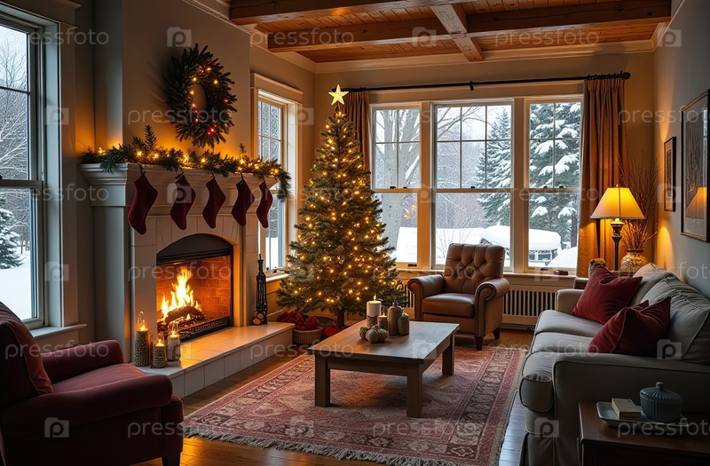 Современный яркий интерьер гостиной дома с камином с рождественским декором, теплыми золотыми огнями гирлянд, большими окнами со снегом и зимой