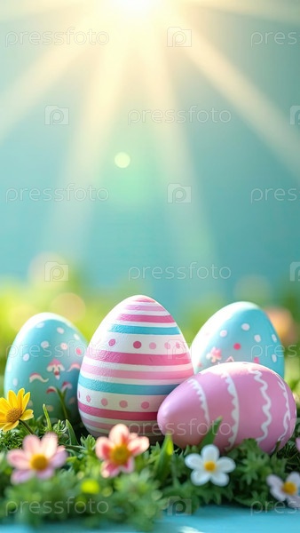 Пасхальные яйца украшены узорами, полосами, волнами, точками солнечных лучей, украшаются весенними пастельными цветами на весенне-синем фоне