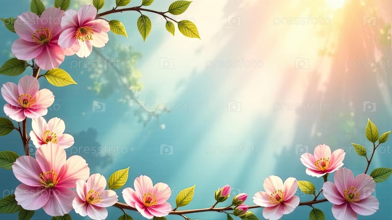 Весенняя тематическая декоративная рама с текстом внутри в солнечных лучах, украшена весенними пастельными цветами на весенне-синем фоне