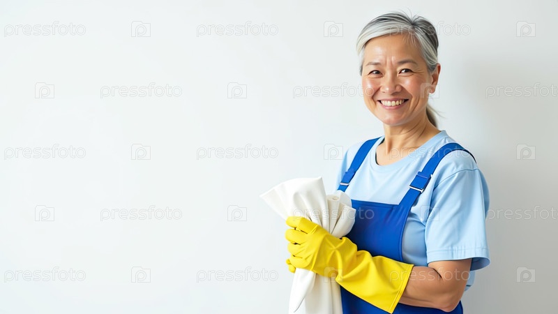 Портрет взрослой азиатской женщины в синем фартуке и желтых резиновых перчатках с тряпкой в руке возле белой стены со свободным местом для текста, услуги очистки окон, уборки дома, горничной