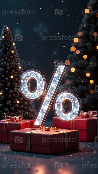 Неон светящийся синий процентный знак на рождественском фоне с елкой, блесками и коробками для подарков. Черная пятница, Новый год, Рождественская распродажа, скидки. баннер, флаер с копировальным пространством. ИИ генерируется