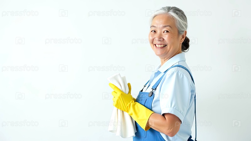 Портрет взрослой азиатской женщины в синем фартуке и желтых резиновых перчатках с тряпкой в руке возле белой стены со свободным местом для текста, услуги очистки окон, уборки дома, горничной