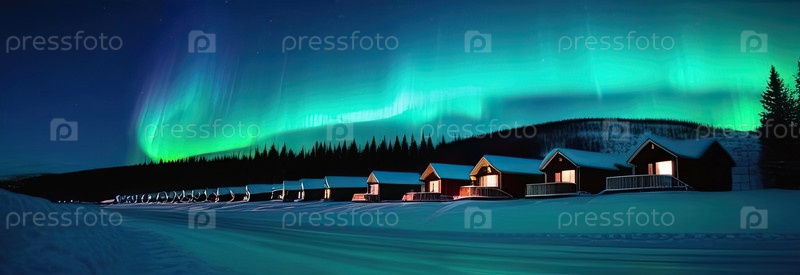 Северные огни в небе над северной деревней со снежными уютными домами зимой