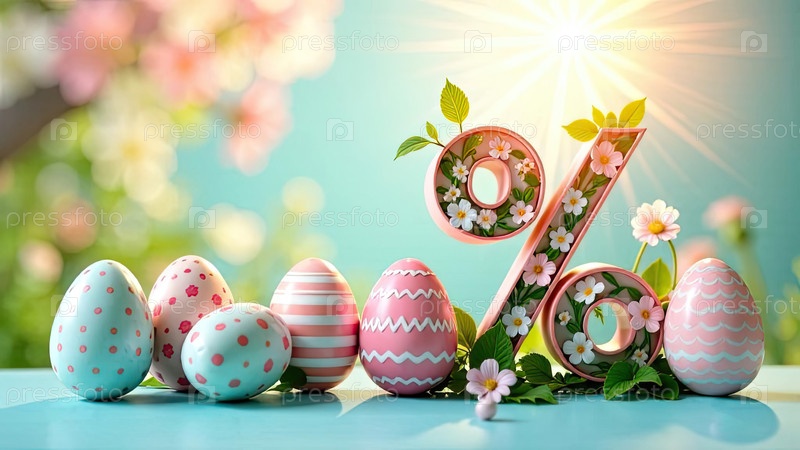 Процентный знак и пасхальные яйца в солнечных лучах, украшены весенними пастельными цветами