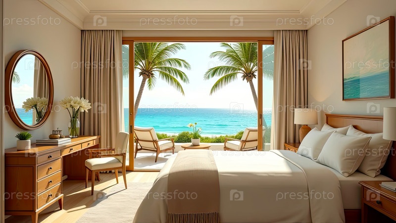 Интерьер гостиничного номера с видом на океан для пляжного отдыха и путешествий