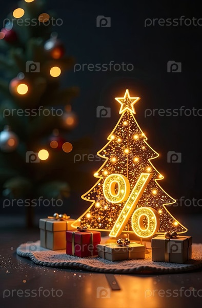 Неон светящийся золотой процентный знак на рождественском фоне с елкой, блесками и коробками для подарков. витрина магазина в Черную пятницу, Новый год, Рождественская распродажа, скидки. баннер, флаер. ИИ генерируется