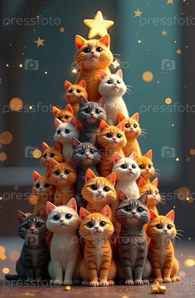 Мультфильмовая рождественская елка из кошек, сделанная на праздничном фоне с блеском, многоцветные сотни кошек складываются в форме высокой Рождественской елки с золотыми светящимися гирляндными огнями