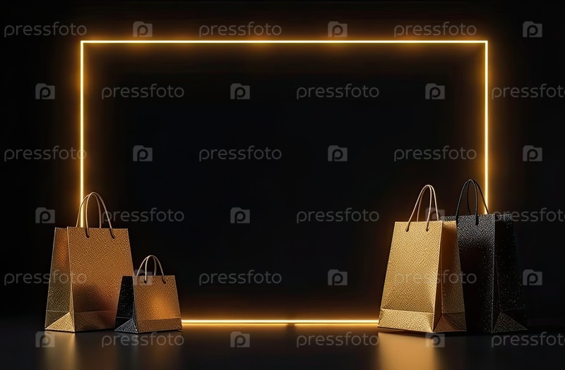 Неоновая светящаяся золотая рама с пространством для текста, процентный знак, сумки покупок на черном фоне. витрина магазина в Черную пятницу, распродажа, скидки, баннер, флаер. ИИ генерируется