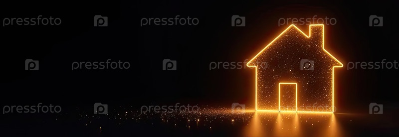 Прозрачное золото светящийся символ дома на черном фоне с золотым блеском. недвижимость, риэлтор, ипотека, страхование, бронирование, строительство, изоляция, отопление. AI generated