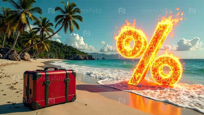 Огненный горящий знак процент И красный чемодан на берегу моря с тропическими пальмами в свете солнца, океанический закат на заднем плане. Горячая летняя распродажа и скидки, горячий баннер тура, листовка. AI генерируется