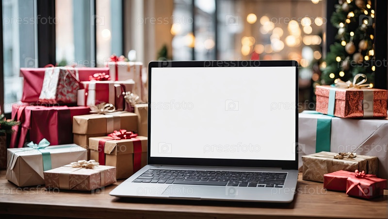Ноутбук с белым экраном макет на столе в офисе рождественского декора с подарочными коробками для сотрудников, магазины, корпоративные подарки, Черная пятница,