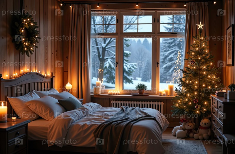 Уютная спальня с кроватью у окна с рождественским декором и елкой, теплыми гирляндами света и свечами - вид изнутри зимой и снегом. Отпразднуйте Рождество и Новый год, рождественское настроение. ИИ генерируется