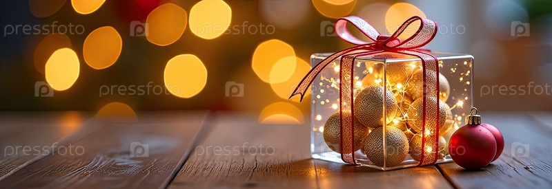 Золотая прозрачная светящаяся коробка для подарков на праздничном фоне с гирляндами боке с пространством для текста. Поздравления, открытки, фон Рождества и Нового года. ИИ генерируется
