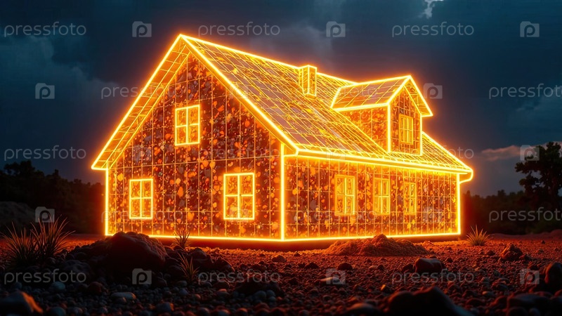 Прозрачное золото светящийся проект дома в натуральном размере на земельной площади. недвижимость, риэлтор, ипотека, страхование, здания, строительство, изоляция, отопление. ИИ генерируется