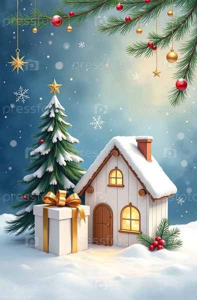 Уютный дом с акварелью и коробка для подарков под елкой на рождественском зимнем снежном фоне с золотыми блесками на поздравительных открытках. недвижимость, риэлтор, ипотека, страхование, бронирование. ИИ генерируется