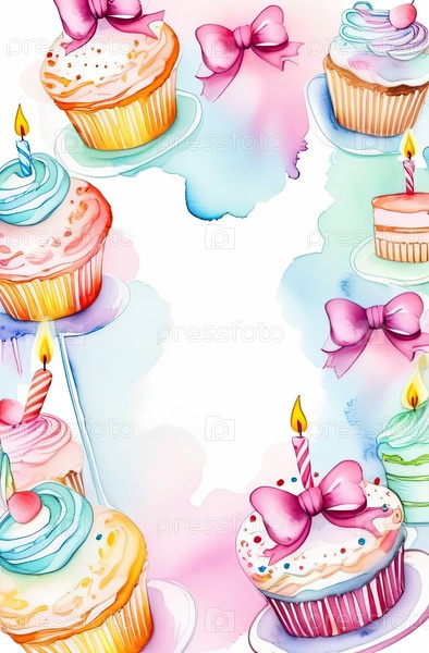 Вертикальная рамка с акварелью на границе кексов, шаблон поздравительной открытки к дню рождения, приглашение с копировальным пространством для личных пожеланий