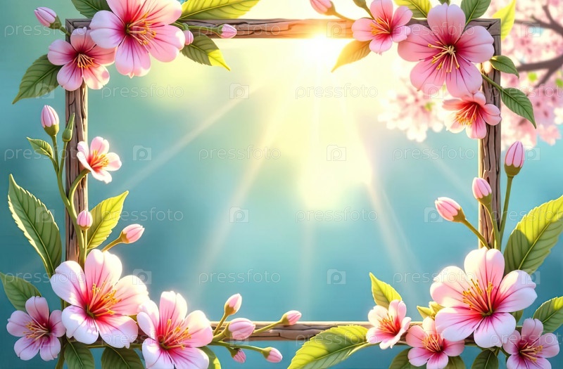 Прямоугольная деревянная декоративная рама с текстом внутри в солнечных лучах, украшена весенними пастельными цветами на весенне-синем фоне