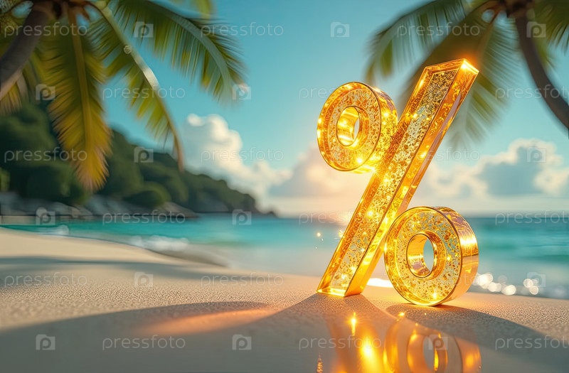 Яркий золотой процентный знак на берегу моря с тропическими пальмами в свете солнца, туристический морской фон. жаркая летняя распродажа и скидки, горящий тур-баннер, флаер. ИИ генерируется