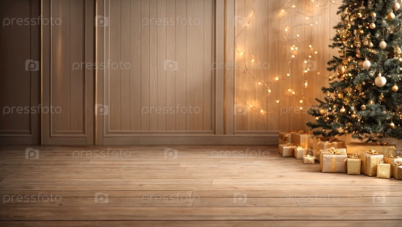Пустой деревянный пол в нейтральных естественных бежевых тонах для отображения продукции со стеной во внутренней части комнаты, с рождественским декором. Копирование пространства, Рождество и Новый год. ИИ генерируется