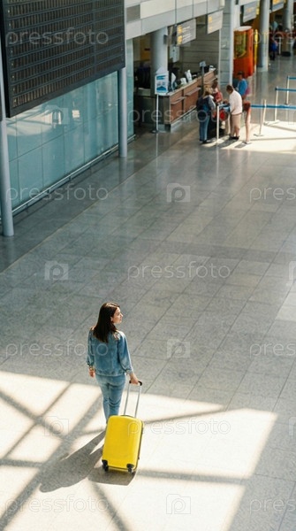 Женщина с желтым чемоданом, идущая одна в солнечном терминале аэропорта, начало путешествия, независимость и приключения, настроение отпускного пути, свобода аэропорта