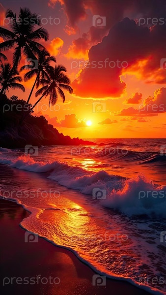 Одинокая пальма на береговой линии заката, золотисто-красное отражение океана, вертикальный тропический фон для веб-страниц или печати
