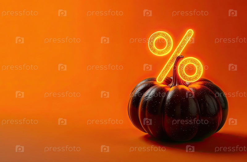 Золотой светящийся процентный знак с тыквой на оранжевом фоне со свободным местом для текста. Осенние распродажи и скидки, баннер Harvest и Halloween, флаер с пространством для копирования. ИИ генерируется