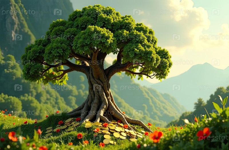 Взрослое зеленое дерево растет из земли и золотые монеты на природном фоне. Древо денег, экономика, финансы, экология, бизнес, стартап. ИИ генерируется