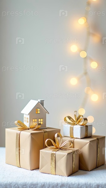 Золото-белый символический дом и подарочная коробка под рождественской елкой на столе Рождественский фон с золотым блестком на поздравительной карточке
