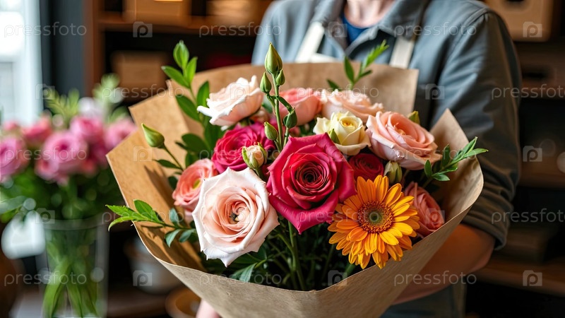 Букет роз и весенних цветов в руках флориста, упакованный в крафт-бумагу в интерьере цветочного магазина, доставка на праздник.Весна, 8 марта, женский день, день рождения. ИИ сгенерировано