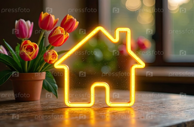 Прозрачное золото светящийся символ дома стол с весенним цветущим солнечным фоном. недвижимость, риэлторская деятельность, ипотека, страхование, бронирование, строительство, изоляция. AI generated