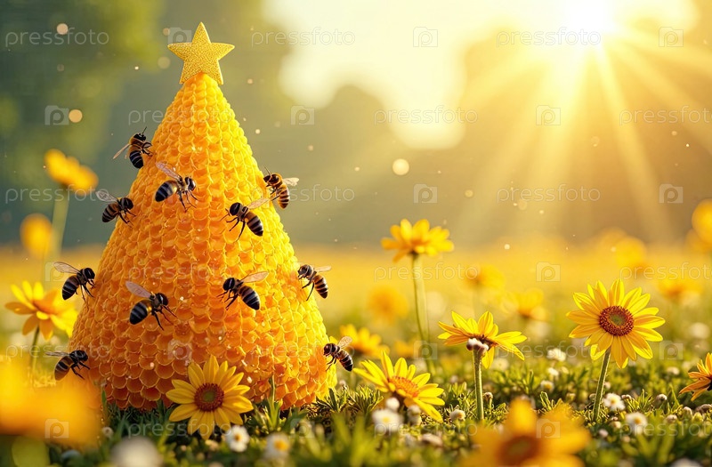 Мед в сосудах в форме конуса рождественской елки с пчелами на летнем поле под солнечным светом.Пчеловодство, Рождество, Новый год.Искусственный интеллект создан