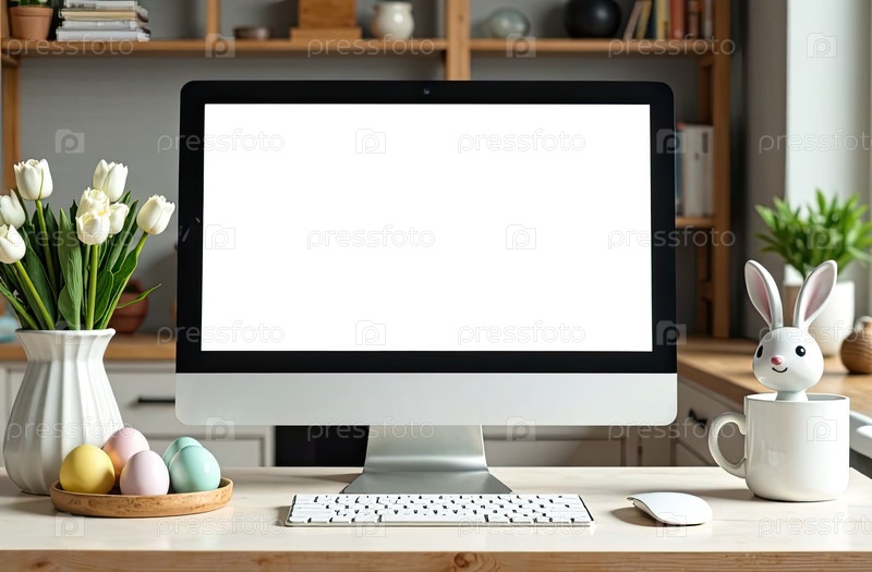 Компьютерный монитор с белым экраном макет на столе в уютном домашнем офисе с цветными яйцами и пасхальным кроликом, букетом весенних цветов в вазе на столе И белой чашечкой кофе
