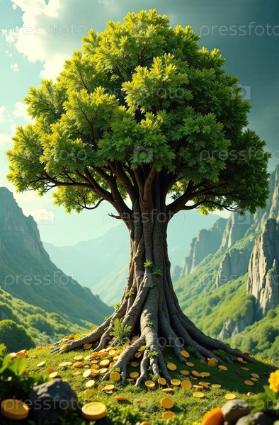 Взрослое зеленое дерево растет из земли и золотые монеты на природном фоне. Древо денег, экономика, финансы, экология, бизнес, стартап. ИИ генерируется