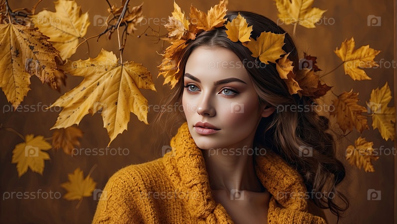 Белая женщина в золотом пальто с короной осенних листьев, портрет осенней красавицы, сезонное тепло, уютное настроение, осенняя мода
